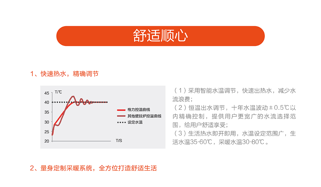 全預混燃燒結合雙寬域功率調節,節能恒溫,溫差在±0.5℃之間,保證熱水四季恒溫快速出熱水,減少水流浪費,生活水溫度35-60℃,采暖水溫30-80℃